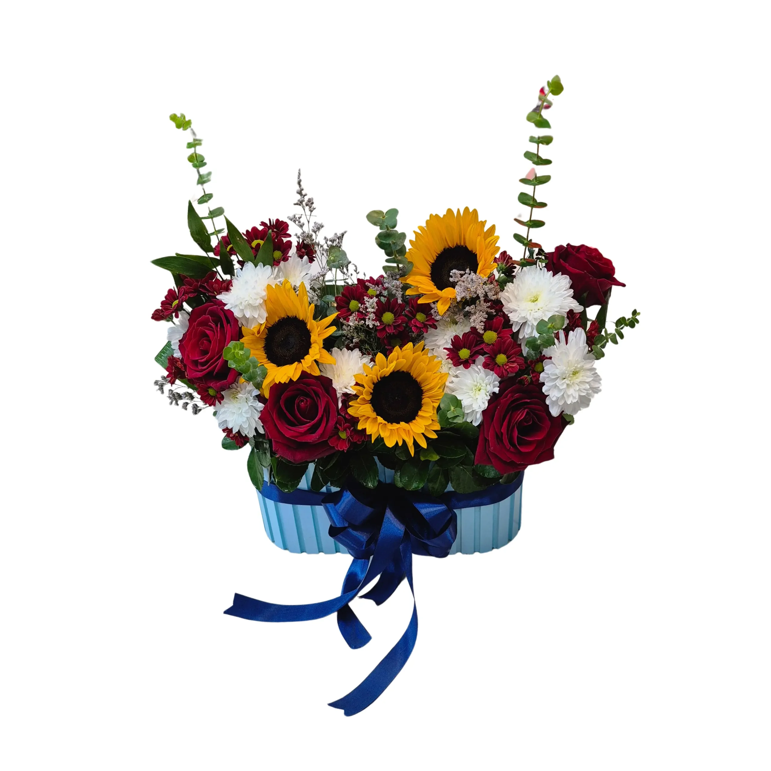 باکس گل آفتابگردان و رز قرمز | گل آفتابگردان و رز قرمز در باکس آبی